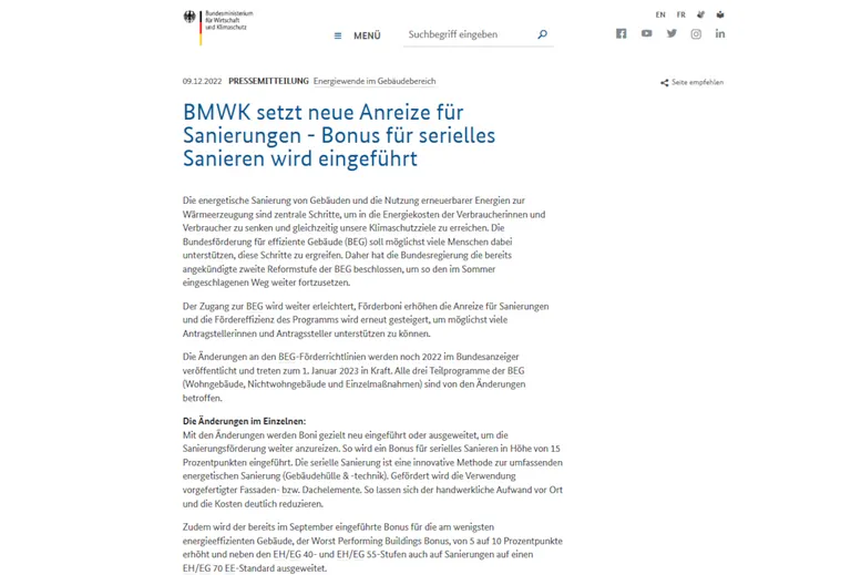 Mit den Änderungen werden Boni gezielt neu eingeführt oder ausgeweitet, um die Sanierungsförderung weiter anzureizen. So wird ein Bonus für serielles Sanieren in Höhe von 15 %-Punkten eingeführt. Die serielle Sanierung ist eine innovative Methode zur umfassenden energetischen Sanierung (Gebäudehülle & -technik). Gefördert wird die Verwendung vorgefertigter Fassaden- bzw. Dachelemente. So lassen sich der handwerkliche Aufwand vor Ort und die Kosten deutlich reduzieren.