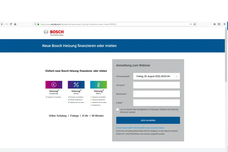 Website zur Anmeldungen zum Webinar Schwerpunktthema Heizung+. – © Screenshot https://www.edudip.com/de/webinar/neue-bosch-heizung-finanzieren-oder-mieten/390620 (Stand 26.08.2020)