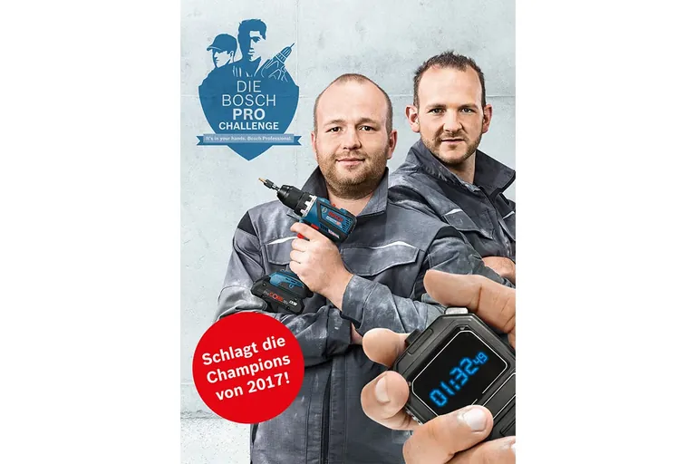 Beim teilnehmenden Fachhandel heißt es jetzt wieder: „An die Akkus, fertig, los!“ Die Aufgabe: In Zweierteams 20 Schrauben schnell und präzise verschrauben, dabei eine vorgegebene Strecke hin und zurück bewältigen und die Bestzeit des Siegerteams der Bosch Pro Challenge 2017 schlagen. Die zehn schnellsten Schrauber-Teams treten im Januar 2019 in einem großen Finale auf der Messe Bau in München gegeneinander an.