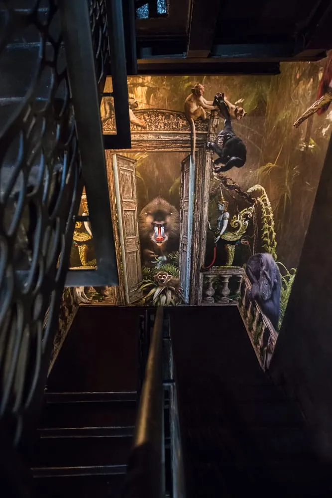 Im Esszimmer verbinden sich alle fünf Zimmerwelten miteinander: Marmortische und -stühle treffen auf farbige Seiden- und Samtstoffe und bunte Vorhänge mit Urwaldpflanzen auf die goldenen Affenskulpturen der Esstische. „Der Dschungel ist das Bindeglied zwischen allem, denn er entsteht, wenn die individuellen Charaktere von uns Menschen aufeinandertreffen“, so Seher. Neben dem großen Esszimmer verwandelt sich vor allem das Treppenhaus in einen Dschungel: Helle Lichtspots inszenieren den dunklen Gang und die Treppenstufen, original präparierte Insekten in Bilderrahmen an der Wand und überdimensionale Tapeten mit üppiger Urwaldszenerie lassen Fantasie und Realität eins werden.