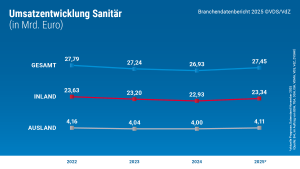 Der Bericht zeigt, dass die Branche in den Jahren 2024 und 2025 vor erheblichen Herausforderungen stand und weiterhin steht. Nach einem nominalen Umsatzrückgang von 4,4 % in 2024 auf insgesamt 77,26 Mrd. Euro wird für 2025 ein weiterer leichter Umsatzrückgang von 0,4 % prognostiziert. Besonders betroffen ist die Industrie mit einem Umsatzminus von 9,5 % im Jahr 2024, während der Sanitärbereich erste positive Signale verzeichnet. Der Großhandel meldet einen Rückgang um 13,2 % und die installierenden Betriebe einen Umsatzrückgang von 4,5 %.
