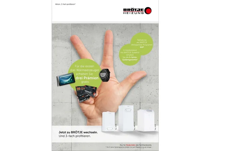 Der Hersteller Brötje setzt seine Aktion „3-fach profitieren“ für Neukunden ohne zeitliche Einschränkung fort. Der Vorteil: Jeder teilnehmende Fachhandwerker registriert drei Wärmeerzeuger im Brötje Aktivpartner Programm BAP und erhält automatisch drei Prämien.