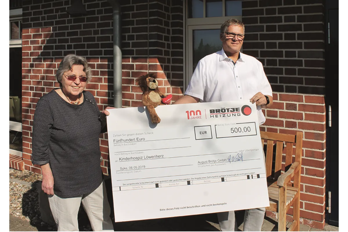 • Am 6. Mai überreichte Herr Andreas Martens als Vertreter von Brötje einen Scheck über 500 Euro an das Kinderhospiz Löwenherz in Syke in der Nähe von Bremen.