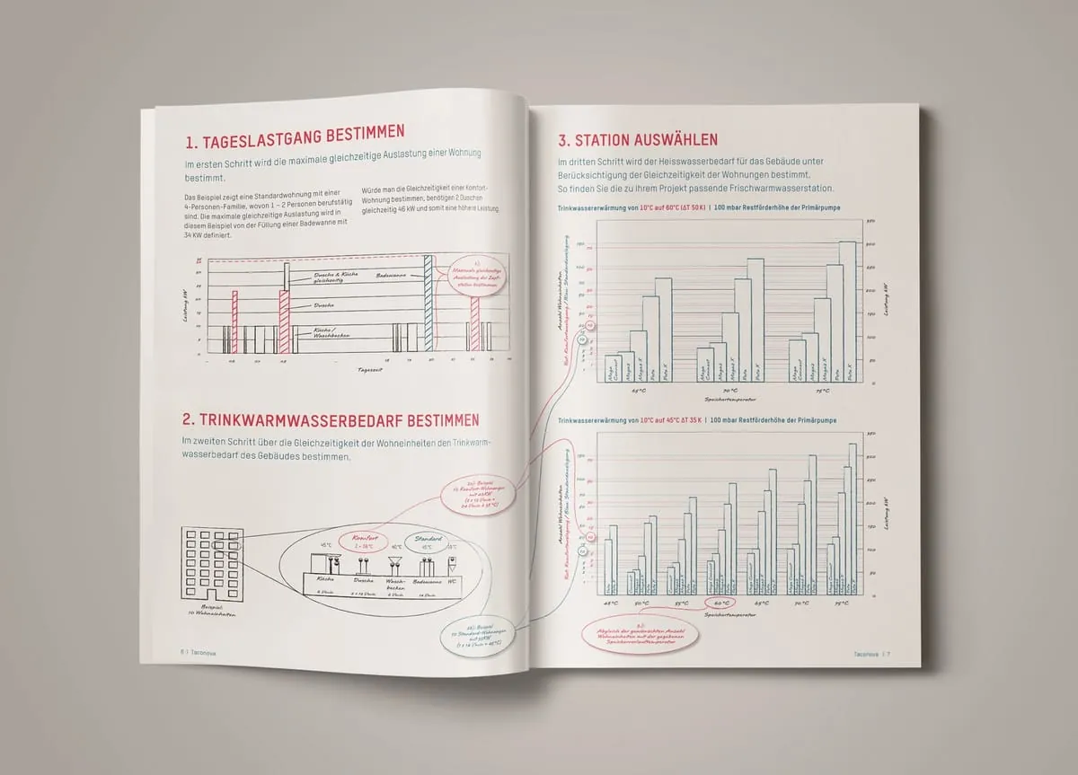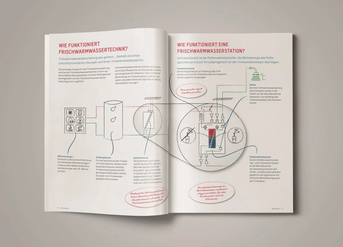 „Die Idee hinter der Broschüre war, sie so übersichtlich, praxisorientiert und anschaulich wie möglich zu gestalten. Der Aufbau ähnelt deshalb einer Präsentation: möglichst viele erklärende, schnell erfassbare Illustrationen und Schaubilder und nur so viel Text wie nötig“, erklärt Taconova-Planerberater Axel Heinlein, der maßgeblich an der Erstellung beteiligt war. Der Nutzer der Broschüre steht dabei laut Heinlein im Fokus: „Wir beantworten auf den zwölf Seiten genau die Fragen, die in der Praxis von Planern und Installateuren am häufigsten gestellt werden.“