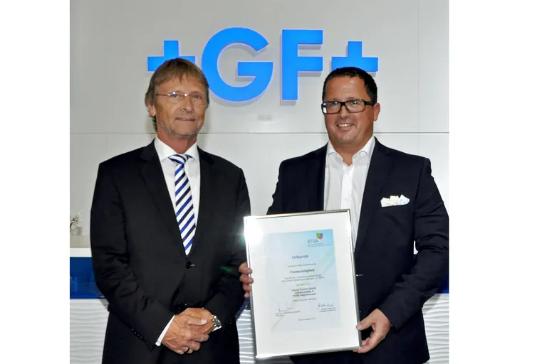 BTGA-Hauptgeschäftsführer Günther Mertz (links) überreicht Udo Jirmann, Geschäftsführer der Georg Fischer GmbH, die BTGA-Mitgliedsurkunde. – © ja/BTGA e. V.