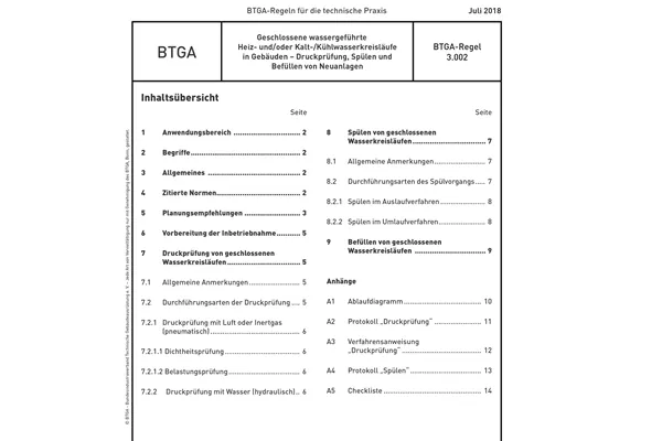 Der Bundesindustrieverband Technische Gebäudeausrüstung (BTGA) hat die Regel 3.002 „Geschlossene wassergeführte Heiz- und/oder Kalt-/Kühlwasserkreisläufe in Gebäuden – Druckprüfung, Spülen und Befüllen von Neuanlagen“ überarbeitet.