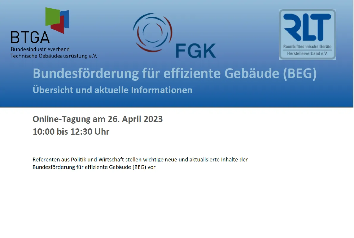 Der BTGA – Bundesindustrieverband Technische Gebäudeausrüstung e.V. wird gemeinsam mit dem FGK – Fachverband Gebäude-Klima e.V. und dem Herstellerverband Raumlufttechnische Geräte e.V. ein Online-Seminar „Bundesförderung für effiziente Gebäude (BEG) – Übersicht und aktuelle Informationen“ durchführen.