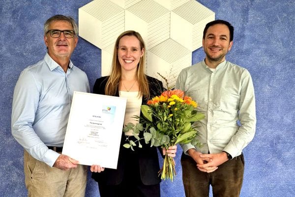 BTGA-Vizepräsident Jan Heckmann überreichte gemeinsam mit Robert von Ascheraden, Geschäftsführer des Landesverbands, die Mitgliedsurkunde an Lea Sophie Welzel, Referentin für Energie und Politik der Clage GmbH.