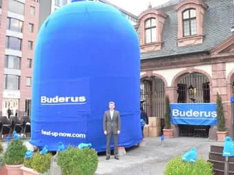 Buderus hat während der ISH den Roßmarkt in Frankfurt mit einer riesigen blauen Pudelmütze dekoriert. Die Mütze ist sieben Meter hoch. Weitere 9.000 Wollmützen in gewohnter Größe hat Buderus in ganz Frankfurt verteilt. Auch die ISH erlebte am Mittwoch ihr blaues Wunder: 6.000 Mützen bestimmten hier das Bild. Wir wollen mit dieser Aktion das Thema Energie stärker im Bewusstsein der Menschen verankern“, sagt Uwe Ladwig, Leiter Vertrieb Buderus Deutschland. Die Pudelmützen sollen darauf aufmerksam machen, dass die Heiztechnik im Keller viel zu oft ein Schattendasein fristet.“ Nur etwa zehn Prozent der in Deutschland installierten Heizungsanlagen sind auf dem aktuellen Stand der Technik. Die veralteten Kessel verursachen enorm hohe Betriebskosten und belasten durch einen viel zu hohen CO2-Ausstoß die Umwelt. Alleine durch den Tausch dieser veralteten Kessel gegen effiziente Heiztechnik ließe sich in Deutschland der Energieverbrauch in Gebäuden um 30 Prozent senken – das sind pro Jahr 55 Millionen Tonnen weniger CO2″, ergänzt Ladwig.