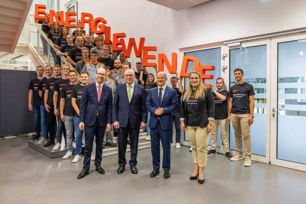 Hunderte Viessmann-Mitarbeiter bereiteten dem Kanzler bei bestem Sommerwetter einen begeisterten Empfang, bevor der Gast aus Berlin mit Prof. Dr. Martin Viessmann und Max Viessmann sowie Führungskräften des Unternehmens ein Gespräch mit Fachhandwerksunternehmern aus ganz Deutschland führte. Dass dieser Austausch den Beginn des hohen Politikbesuches markierte, war kein Zufall: Dem Handwerk kommt bei der Realisierung der Energiewende eine Schlüsselrolle zu. Eines der größten Hemmnisse dabei ist der Mangel an Fachkräften. Nach Berechnungen des ZVSHK fehlen bis zum Jahr 2030 rund 60.000 zusätzliche Monteure, um das politische Ziel, bis dahin sechs Millionen neue Wärmepumpen zu installieren, erreichen zu können. Gegenstand des Gesprächs waren deshalb sowohl neue Ideen und Wege, Fachkräftenachwuchs zu generieren, als auch Chancen, komplexe Technik schneller als bisher einzubauen.