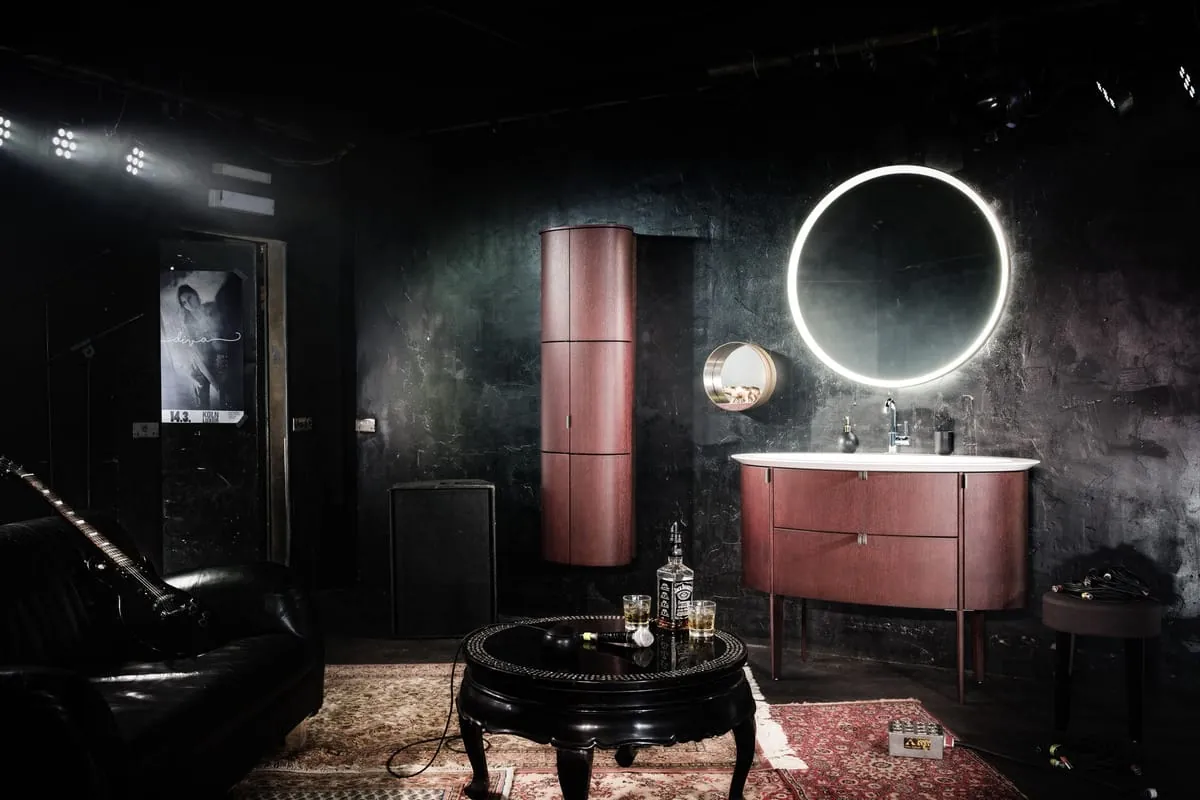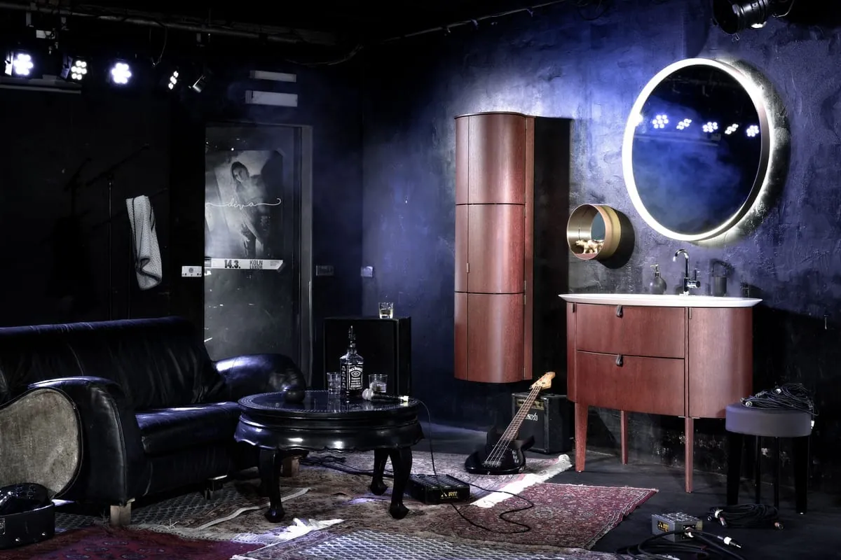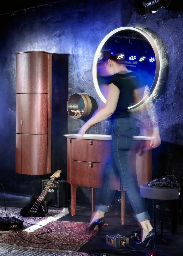 Wer spielt hier die Hauptrolle? Wie wird ein edles Möbel in einer deutlich weniger edlen Umgebung wahrgenommen? Kann es glänzen oder wird es runtergezogen? Der Badmöbelhersteller burgbad wagte die Probe und machte seine neue Kollektion Diva 2.0 kurzerhand zum Protagonisten einer Backstage-Inszenierung. Das experimentelle Shooting zeigt die Leadsängerin einer Grunge-Band vor ihrem großen Auftritt. Das Setting spielt im Bühnenbereich des Kölner Kult-Clubs Luxor, wo sich schon viele heute sehr bekannte Gruppen vor ihrem Durchbruch die Klinke in die Hand gaben. Das brandneue, in Echtholzfurnier gearbeitete Waschtischensemble Diva 2.0 gehört allerdings nicht zur normalen Club-Ausstattung.