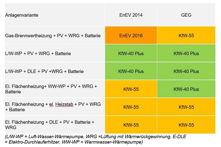 Die innovative Kombination von Gebäudehülle und Anlagentechnik kann so gefördert werden und entspricht dem technologieoffenen Ansatz des GEG: Die Erfüllung der primärenergetischen Anforderungen und auch die von KfW-Effizienzhäusern ist mit elektrischen Flächenheizungen in Verbindung mit PV-Strom und einer Lüftung mit Wärmerückgewinnung möglich und wirtschaftlich attraktiv.