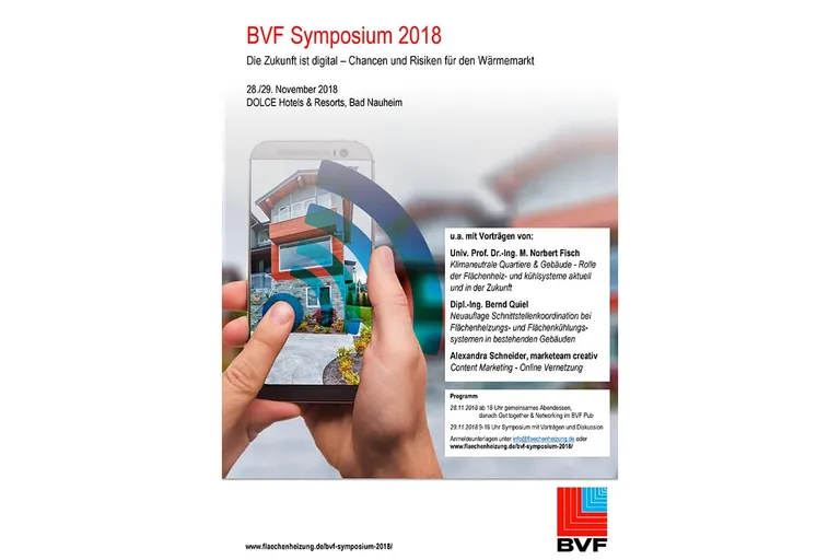 Der Bundesverband Flächenheizungen und Flächenkühlungen e.V. (BVF) lädt Unternehmer aus Industrie, Architektur, Planung, Wohnungswirtschaft und Handwerk zum Fachsymposium am 28./29. November 2018 nach Bad Nauheim ein.