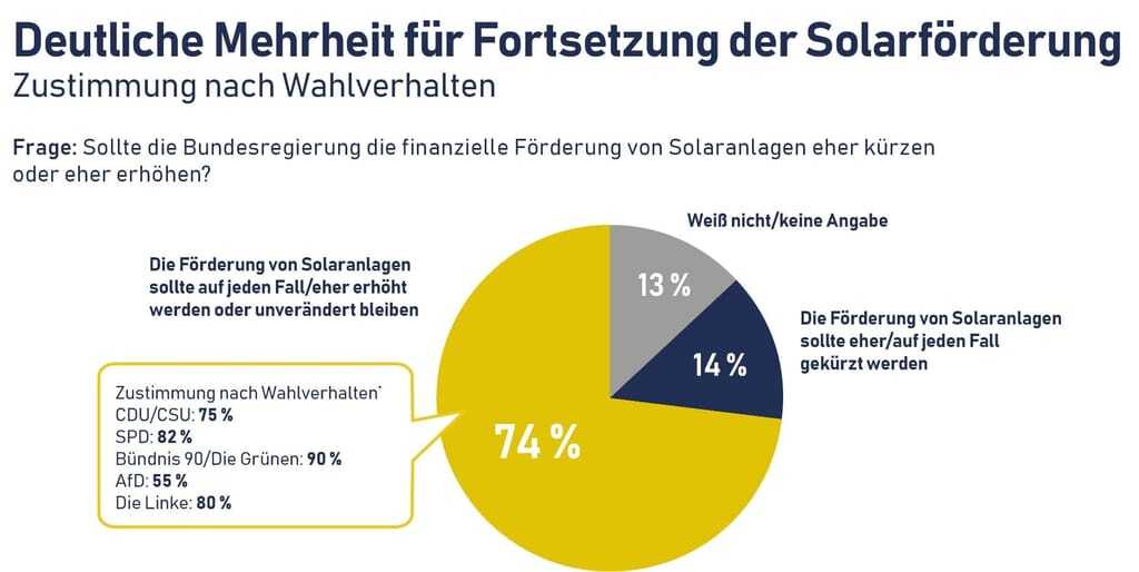 Laut der Umfrage wünscht sich eine deutliche Mehrheit von rund 78 % der Bevölkerung, dass die Bundesregierung den Ausbau der Solarenergie beschleunigt oder auf aktuellem Niveau weiterführt. Unter Anhängern der Union sind es sogar rund 86 Prozent. Auch die EEG-Förderung (Einspeisevergütung) hat sehr hohe Akzeptanzwerte: Drei von vier Deutschen, die im vergangenen Jahr die Union wählten, gaben in der YouGov-Umfrage an, dass die Förderung von Solaranlagen eher erhöht werden oder unverändert bleiben solle. Nur etwa jeder siebente (14 %) ist der Meinung, dass die Förderung von Solaranlagen gekürzt werden solle.