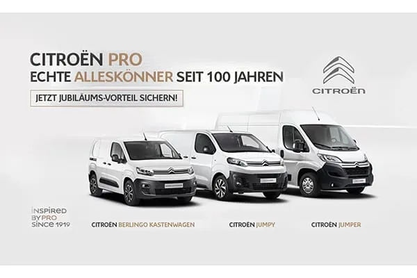 Im Rahmen ihrer Jubiläumsaktivitäten startet die Marke Citroën mit der Kampagne „Echte Alleskönner seit 100 Jahren“ in das vierte Quartal. Die Jubiläumsangebote sind speziell auf Gewebetreibende zugeschnitten und gelten für die Citroën Nutzfahrzeugmodelle Berlingo, Jumpy und Jumper.