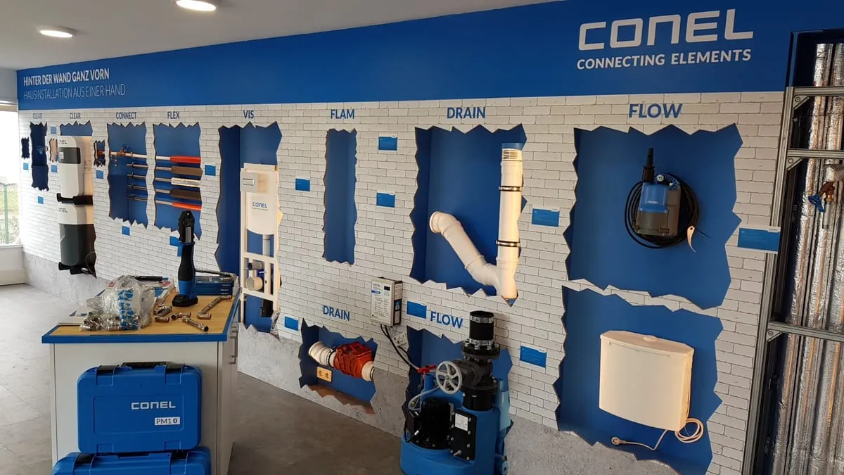 Ob Norden, Süden, Osten oder Westen: der 14 Meter lange ausfahrbare Auflieger zieht Blicke auf sich. Conel wirbt auf der modern gestalteten Außenhaut des Trucks mit seinen Mehrwerten wie dem kompletten Sortiment für die Hausinstallation und zehn Jahren Nachkaufgarantie. Gerade die „inneren Werte“ des Trucks dürften für Fachhandwerker interessant sein: Auf einer Breite von zehn Metern präsentiert Conel dem Fachhandwerk seine verschiedenen Sortimentsbereiche von der Clear-Wasseraufbereitung über die schallgedämmten Drain-Abflussrohre und das Vorwandinstallationssystem VIS von Conel bis zu Werkzeugen.