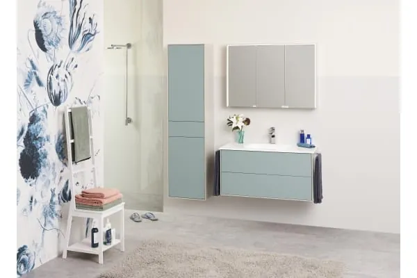 Die mit dem German Design Award 2021 ausgezeichnete Systemserie Ikona ist nicht nur in drei Öffnungsvarianten erhältlich sondern kann auch an Korpus und Front im Farbmix gestaltet werden. – © Conform Badmöbel
