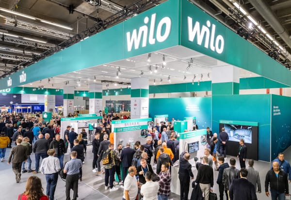 Mit dem Thema „Wir bieten nachhaltige Lösungen“ macht Wilo auf seinem Messestand die eigene Nachhaltigkeitsausrichtung mit den drei Wirkbereichen Creating, Caring, Connecting erlebbar und präsentiert Antworten auf die gestiegenen Umweltanforderungen der Branche.