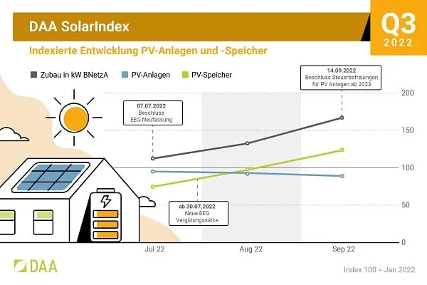 Der DAA SolarIndex zeigt im dritten Quartal 2022 eine verlässlich positive Entwicklung im Solarsektor. Photovoltaik-Anlagen sind auf solidem Niveau nahezu gleichbleibend nachgefragt, während das Interesse an PV-Speichern kontinuierlich steigt.