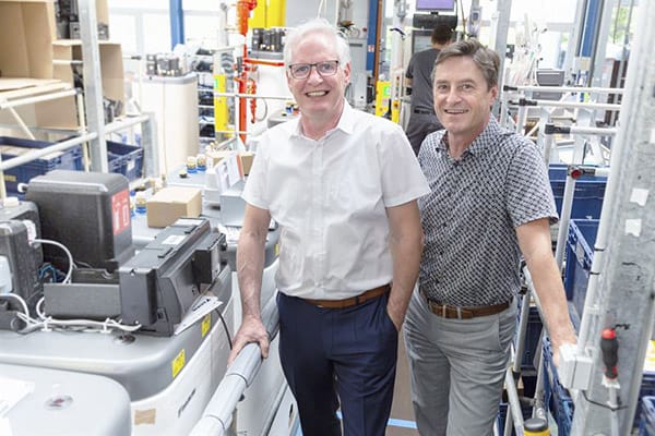Markus Laging, Werkleiter, Daikin Manufacturing Germany GmbH (li.) und Filip De Graeve, Geschäftsführer Daikin Manufacturing Germany GmbH und Daikin Airconditioning Germany GmbH in der Produktion am Standort Güglingen. – © Daikin