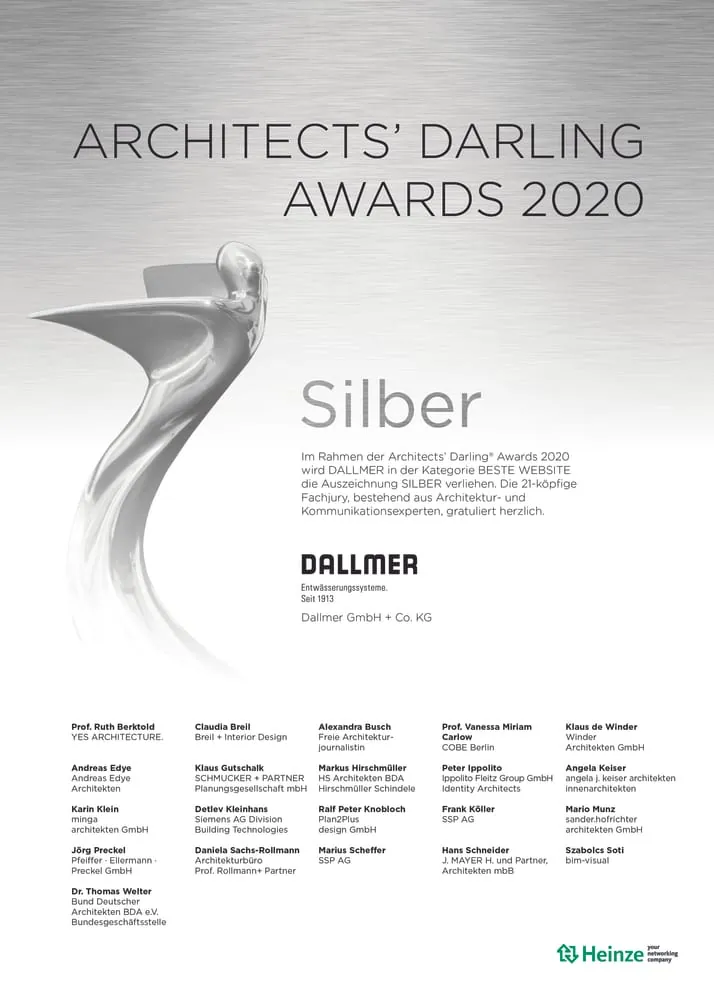 Zum zehnten Mal verlieh Branchenspezialist Heinze den Architects‘ Darling. Insgesamt reichten 200 Hersteller Produkte und Projekte ein, die von 1.900 Architekten und Architektinnen bewertet wurden. Entwässerungsspezialist Dallmer ist wieder mit dabei gewesen und erhielt Silber seine Website.