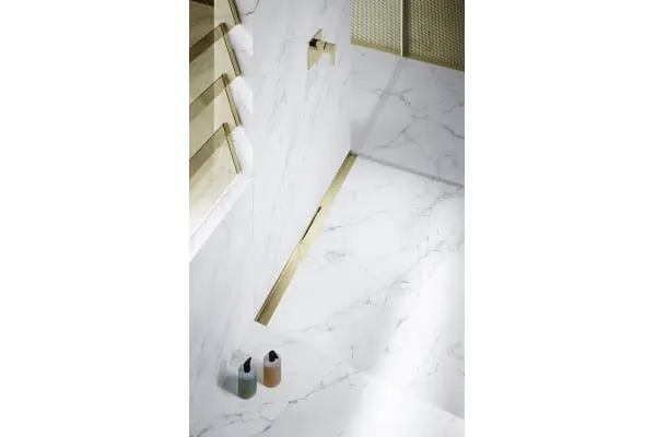 Auch die Duschrinnen in den aktuellen Trendfarben Rotgold, Anthrazit und Messing des Arnsberger Herstellers sind mit dem System kompatibel.