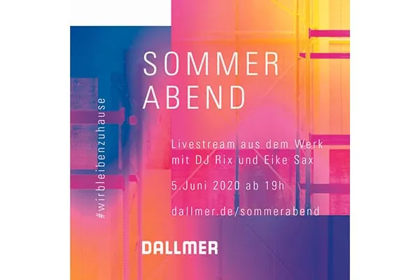 Der Sommerabend von Entwässerungsspezialist Dallmer findet am 05.06.2020 ab 19 Uhr per Livestream statt. Dort kann jeder für zwei Stunden den Klängen des DJs Dennis Rixen sowie des Saxophonisten Eike von der Leyen lauschen.
