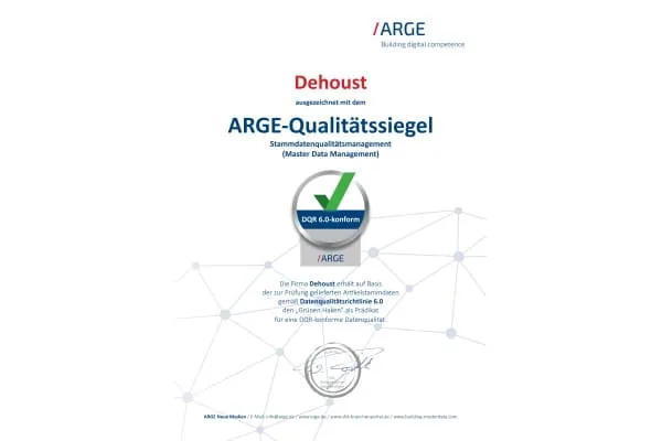 Die Artikel-Stammdaten der Firma Dehoust wurden mit dem ARGE-Qualitätssiegel ausgezeichnet. Das Siegel bescheinigt, dass Dehoust Produktstammdaten nach den mit DG Haustechnik und ZVSHK abgestimmten Prüfkriterien liefert.