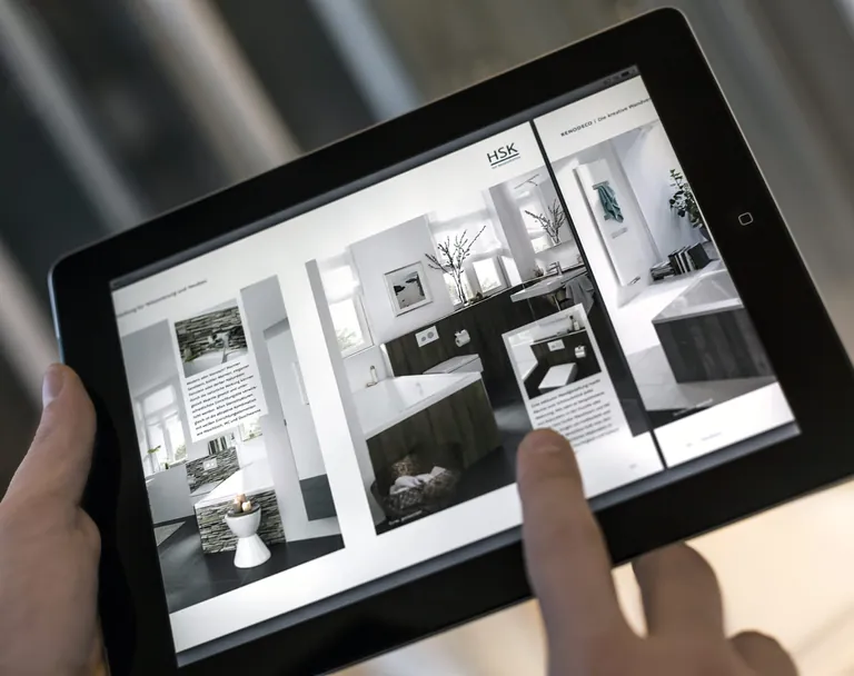Überall dabei: der HSK-Gesamtkatalog. Mit Hilfe der Katalog-App stehen alle Produktabbildungen und Serieninfos zur Verfügung – für Planung, Beratung und Verkauf. – © HSK Duschkabinenbau KG