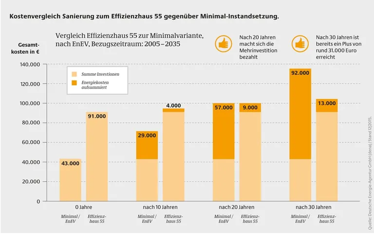 Bei dem untersuchten Beispiel in Bedburg, Nordrhein-Westfalen, standen die Bauherren im Jahr 2005 beim Kauf ihres Einfamilienhauses vor der Entscheidung, es für rund 43.000 Euro minimal in Stand zu setzen oder es umfassend zu einem KfW-Effizienzhaus 55 zu sanieren. Sie setzten auf Energieeffizienz und damit auf eine gute Dämmung der Außenwände, des Kellers und des Dachraumes, hochwertige Wärmeschutzfenster, eine moderne Heizungs- und Lüftungsanlage sowie eine Solarthermieanlage. Dafür erhielten die Bauherren damals rund 20.000 Euro Förderung, heute wären es sogar 10.000 Euro mehr. Die gesamten Kosten für die Sanierung zum Spitzenstandard lagen nach Abzug der Förderung bei rund 91.000 Euro – etwa 48.000 Euro mehr, als für die Minimal-Instandsetzung ohnehin nötig gewesen wäre.