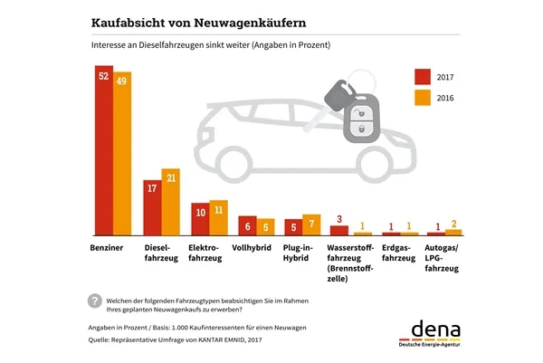 Fahrzeuge mit Dieselantrieb verlieren die Gunst der Verbraucher. Das Kaufinteresse sinkt im Vergleich zum Vorjahr weiter von 21 auf nur noch 17 Prozent. Alternative Antriebe können von dieser Entwicklung nicht profitieren: Die Kaufabsicht für Elektrofahrzeuge inklusive Hybridantriebe ist ebenfalls leicht rückläufig und sinkt um 2 Prozent auf 21 Prozent. Benziner hingegen legen um 3 Prozent zu und stoßen mit 52 Prozent auf das höchste Kaufinteresse. Das sind die Ergebnisse einer repräsentativen Umfrage der Deutschen Energie-Agentur (dena) unter potenziellen Neuwagenkäufern.