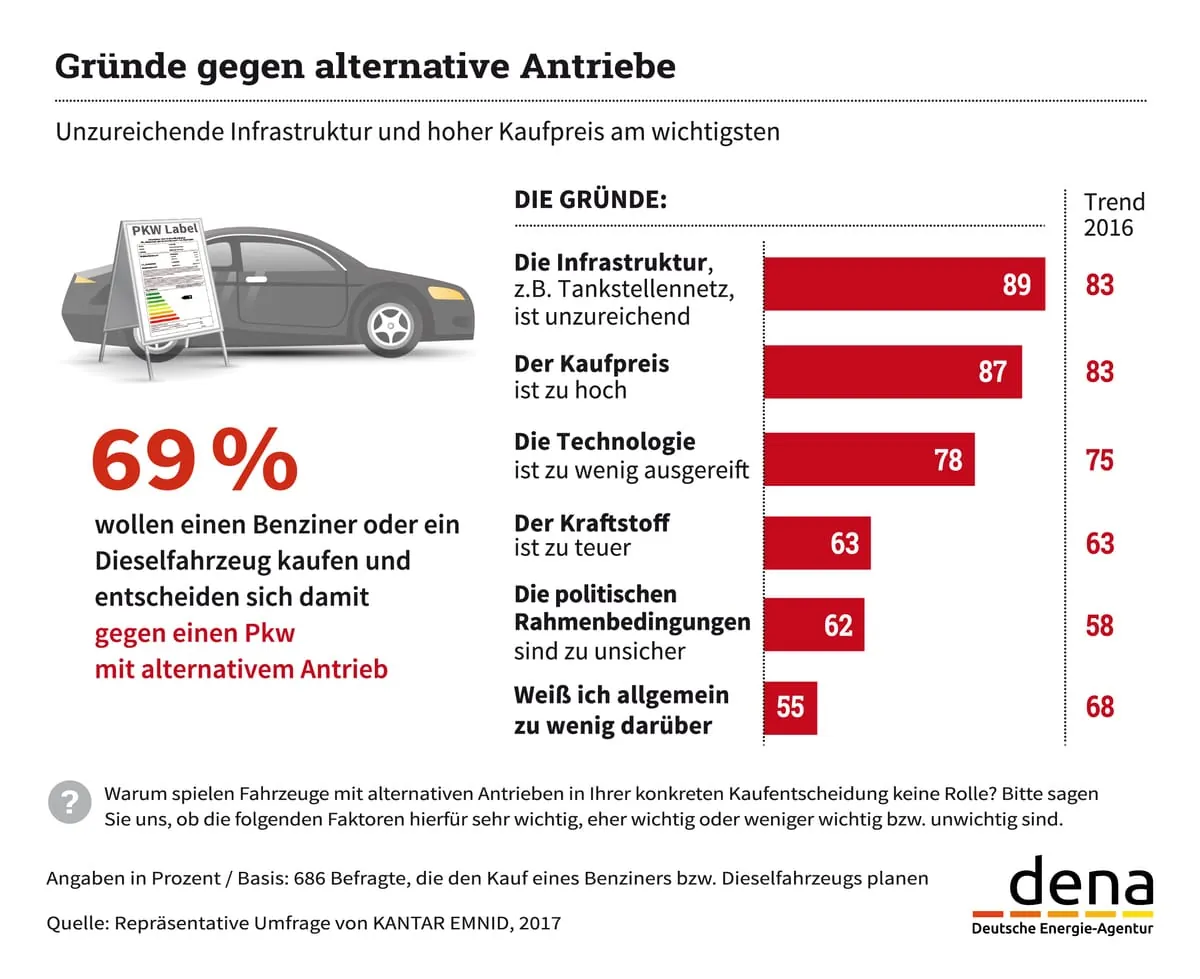 Als Gründe gegen den Kauf alternativer Antriebe nennen die Befragten unter anderem die unzureichende Infrastruktur (89 Prozent), den zu hohen Kaufpreis (87 Prozent) und die zu wenig ausgereifte Technologie (78 Prozent). Im Vergleich zum Vorjahr haben sich diese Bedenken verstärkt. Dass der zu hoch empfundene Kaufpreis eine entscheidende Rolle spielt, zeigt eine weitere dena-Umfrage, die im August 2017 veröffentlicht wurde. Demnach würden sich 23 Prozent für ein Elektrofahrzeug entscheiden, wäre der Preis für alle Fahrzeugantriebe gleich – die Kaufabsicht würde sich also mehr als verdoppeln.