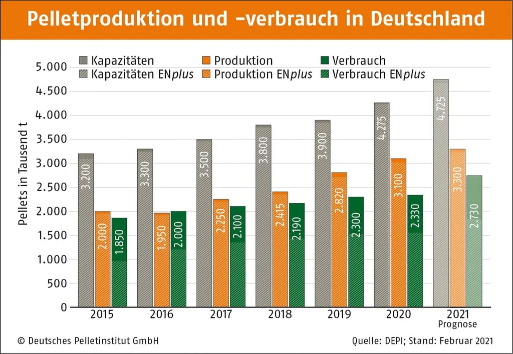 Pelletproduktion und -verbrauch mitENplus 2021. – © Deutsches Pelletinstitut