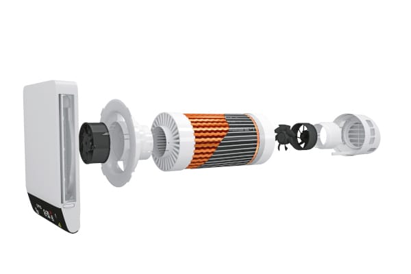 Zur Beförderung von bis zu 70 m3/h nimmt das dezentrale Lüftungsgerät maximal eine Leistung von 22 W auf. Es erreicht damit nahezu die Leistung von größeren Systemen und erfüllt zudem die Kriterien der Energieeffizienzklasse A. Der integrierte Wärmetauscher aus Kupfer erreicht eine effektive Wärmerückgewinnung von bis zu 88 %. Damit eignet er sich hervorragend für die Wohnraum Be- und Entlüftung und integriert sich durch sein schlichtes Design in Innenräume.