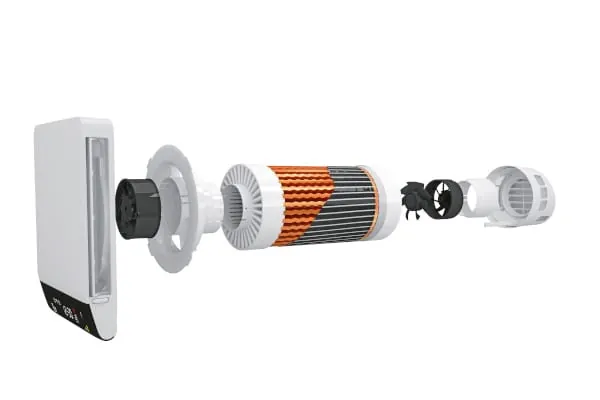 Zwei hocheffiziente EC-Ventilatoren sorgen für den Lufttransport. Ein integriertes Folienheizregister kann zugeschalten werden, um die Zulufttemperatur bei niedrigen Außentemperaturen zu erhöhen. Dabei verfügt das System über einen Abtau-Algorithmus, der ein Einfrieren des Kupfer-Wärmetauschers verhindert.
