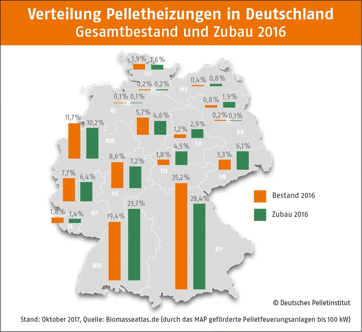 Bentele wies darauf hin, dass der Freistaat beim jährlichen Zubau im Bundesvergleich jedoch seit mehreren Jahren an Boden verliert: „Der Anteil Bayerns an den 2016 installierten Pelletheizungen und -kaminöfen beträgt nur noch 28 %, womit man die Führung in dieser Statistik nur knapp vor Baden-Württemberg (24 %) verteidigen konnte.“ Die rückläufige Entwicklung beim Zubau von Pelletfeuerungen in Bayern hat nach Einschätzung des DEPV mehrere Gründe: Die niedrigen Preise für fossile Energieträger seien genauso dafür verantwortlich wie auch das nachlassende Interesse des Handwerks, sich mit erneuerbaren Energien (Holzpellets, Wärmepumpe, Solarthermie) am Heizungsmarkt auseinanderzusetzen. Diese Hindernisse werden in Bayern noch durch eine zusätzliche finanzielle Förderung zur Bundesförderung für den Einbau einer neuen Ölheizung verschärft, so der Branchenverband.