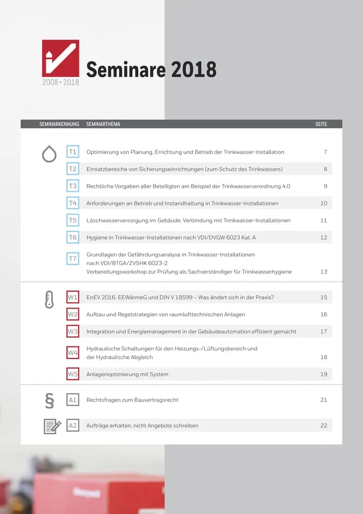 Aktuelle gesetzliche oder technische Neuerungen bilden auch 2018 die Schwerpunkte der 85 Seminare. So werden im Bereich Trinkwasser rechtliche Veränderungen aufgegriffen, aber auch zu den Themen Hygiene, Wartung und Optimierung von Trinkwasserinstallationen gibt es Angebote. Die Seminare rund um Gebäudeinstallationen stellen die Betrachtung des Gesamtsystems zur Energieeinsparung in den Vordergrund. Branchenübergreifend werden Seminare zu Bauvertragsrecht und zur Verbesserung der Auftragslage angeboten.