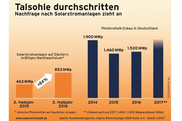 Während die Photovoltaiknachfrage im Ausland seit Jahren boomt, rechnet die Interessenvertretung der Solar- und Speicherunternehmen in Deutschland erst in diesem Jahr wieder mit einem Marktwachstum im unteren zweistelligen Prozentbereich. Dieses werde durch attraktive Renditeerwartungen und niedrige Finanzierungskosten befördert. Neben den stark gesunkenen Photovoltaikpreisen dürfte dazu auch beitragen, dass ein Großteil künftiger Investoren den selbst erzeugten Solarstrom weiterhin selbst verbrauchen darf und auch künftig an keiner Auktion teilnehmen muss, um eine Förderberechtigung für den eingespeisten Überschussstrom zu erzielen. Die Verpflichtung zur Teilnahme an einer Ausschreibung gilt seit Jahresbeginn für Solarkraftwerke mit mehr als 750 kW Spitzenleistung. Eigenheimbesitzer und die meisten Gewerbebetriebe sind laut BSW nicht von der letzten EEG-Novelle betroffen.