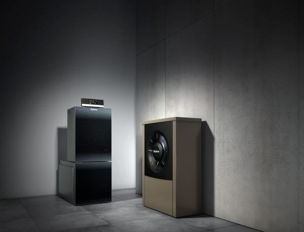 Auf dem digitalen Technikforum von Buderus sind auch hybride Lösungen Thema wie z. B. die Wärmepumpe Logatherm WLW196i (rechts im Bild) kombiniert mit dem Gas-Brennwertkessel Logano plus KB192i. – © Buderus