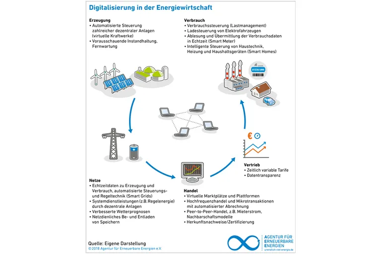 „Energiewende und Digitalisierung sind untrennbar miteinander verbunden“, sagt Philipp Vohrer, Geschäftsführer der Agentur für Erneuerbare Energien. Digitale Technik wird an allen Stufen der Wertschöpfungskette der Energiewirtschaft Einzug halten – von der Energieerzeugung über die Netze und den Handel bis zu den Verbrauchern. Damit sind viele Chancen, aber auch große Herausforderungen verbunden. Das geht aus der Metaanalyse „Die Digitalisierung der Energiewende“ hervor.