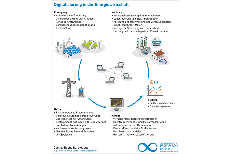 Im Stromhandel schafft die Digitalisierung die Möglichkeit für Mikrotransaktionen. Das heißt, es könnte sich beispielsweise für Besitzer einer Photovoltaikanlage lohnen, ihren Strom selbst an wechselnde Kunden zu verkaufen, je nach Wetterlage und Strombedarf. Bisher würde es sich nicht lohnen, kleine Strommengen abzulesen und dafür an jeden Kunden eine Rechnung zu schreiben. Mit der Blockchain-Technologie würden diese Mini-Geschäfte automatisiert abgewickelt und abgerechnet und dadurch sowohl technisch als wirtschaftlich möglich. Noch steckt hinter der Technik ein enorm hoher Rechenaufwand, der einen immensen Energieverbrauch nach sich zieht.