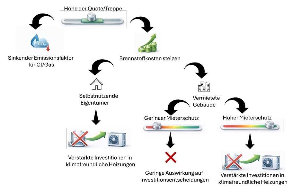 Ob dieser Lenkungseffekt tatsächlich eintritt, so die Studienautoren, hänge für vermietete Gebäude maßgeblich von der Ausgestaltung des Mieterschutzes ab. Sind zusätzliche Brennstoffkosten weitgehend umlagefähig, verlieren steigende Quoten ihre investitionslenkende Wirkung – insbesondere im vermieteten Bestand.