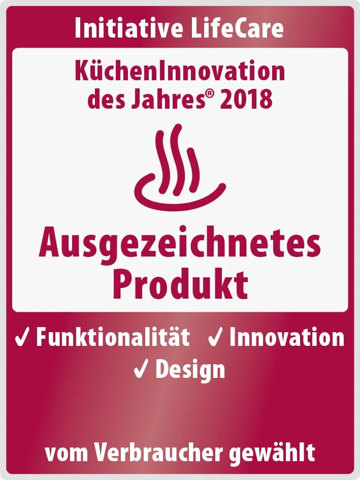 Mit der Prämierung „KüchenInnovation des Jahres 2018 – Ausgezeichnetes Produkt“ gibt die Initiative LifeCare den Konsumenten eine einfache, objektive und transparente Orientierung an die Hand, die sich weltweit als eine wichtige und vielbeachtete Hilfe bei Kaufentscheidungen etabliert hat.