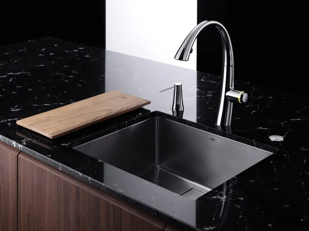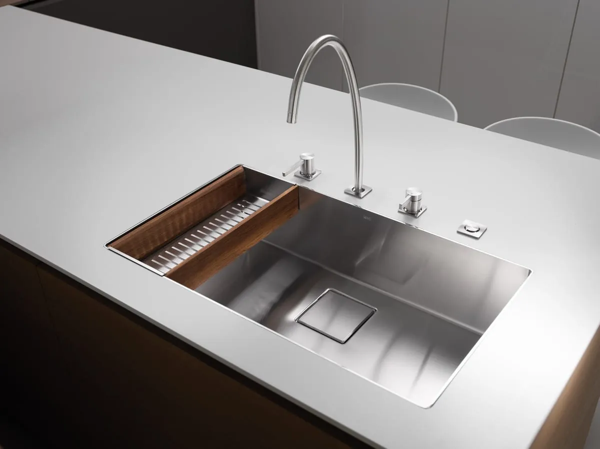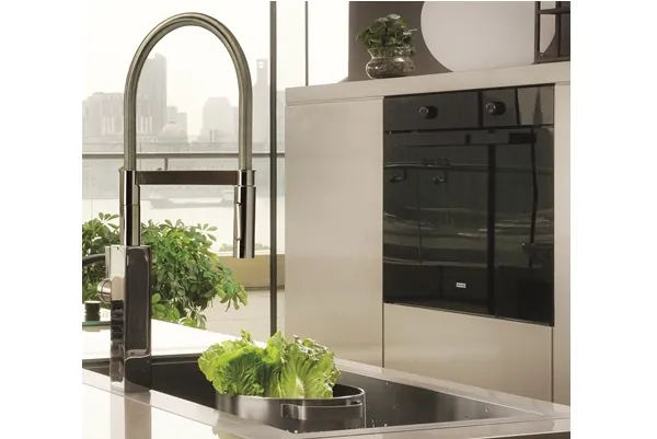 Mit KWC ERA hat Franke eine High-End-Produktlinie entwickelt, bei der hochfunktionale und extrem präzise gefertigte Armaturen und Spülen perfekt miteinander harmonieren – und das in einem sehr minimalistischen und schlanken Design. So sind beispielsweise die Spülen mit einem „Ghost Overflow“ ausgestattet, also mit einem Überlauf, der mit bloßem Auge nicht sichtbar ist.