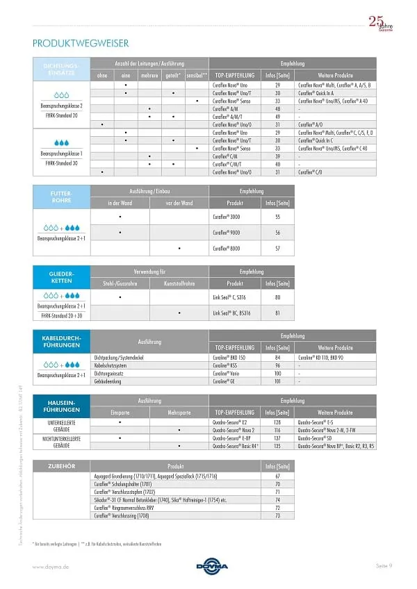 Eine große Stärke des Handbuches ist die Einfachheit, durch die reduzierte Visualisierung bautechnischer Gegebenheiten, mit wesentlichen, regelungstechnischen Hinweisen (Planungshilfe des Fachverbands Hauseinführungen für Rohre und Kabel e.V.). Sicherheit und Schnelligkeit sollen gewährleisten werden, indem die geeigneten Doyma-Produkte mit allen technischen Details aufgelistet werden. Für besondere bauliche Gegebenheiten können Sonderkonstruktionen erforderlich sein, die individuell gefertigt werden müssen.