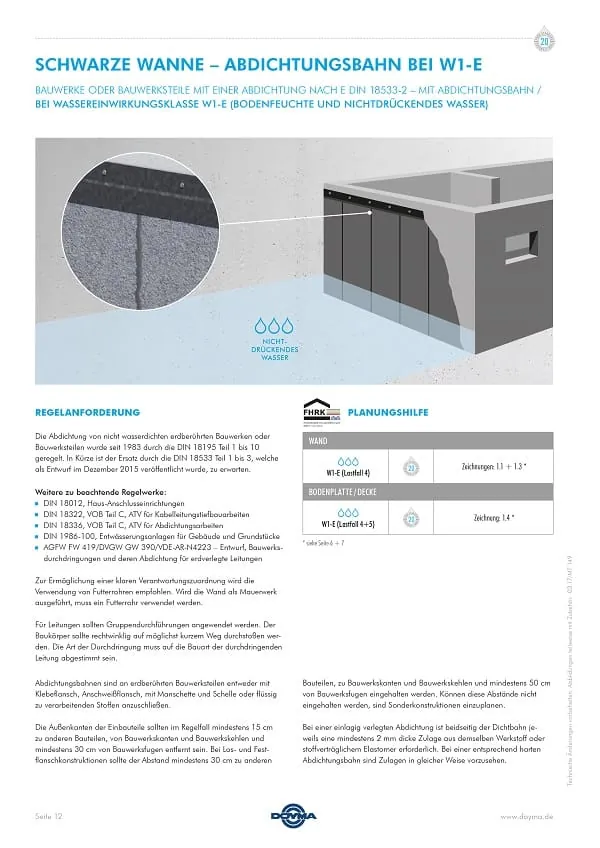 Sicheres Handeln basiert auf dem Wissen über den allgemein anerkannten Stand der Technik: Daher bietet das Kapitel „Grundlagen“ u.a. wichtige Informationen zum neuen Normenentwurf der DIN 18533 „Abdichtung von erdberührten Bauteilen“ sowie zu den Verbands-Regelwerken, Sanierungen im Bestand, Zulassungen, DIN-Normen und zentrale Einbaubeispiele.