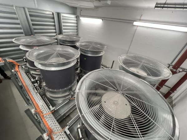 Um sie in diesem Hybrid-Hochhaus nun deutlich kleiner ausführen zu können, kamen aktiv geregelte Abströmschächte zum Einsatz. Die Abströmung erfolgt auch hier mittels vertikal verlaufender Abströmschächte. Dabei werden die Druckverluste der Luft durch redundante Abströmsysteme aus Ventilatoren und schnellregelnden Klappen überwunden. Diese sind auf den Schächten positioniert und saugen die Luft dynamisch aus dem Brandgeschoss über eine permanente Differenzdruckmessung und Regelung des Abström-Volumenstroms ab.