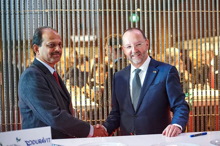Gleich am Vormittag des ersten Tages der ISH, der weltweit größten Messe für Sanitär, Heizung und Klima, unterzeichneten der Vorstandsvorsitzende der Duravit AG, Dr. Frank Richter und Umesh Magar, Technischer Direktor des Projektentwicklungsunternehmens „Magapatta Township Development and Construction Co. Ltd.“ den Vertrag über die Lieferung von rund 20.000 Bädern.
