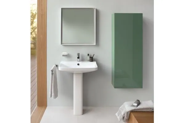 Der dünne Rand des Waschbeckens ist sehr komfortabel: Becken und Hähne sind leicht zu erreichen, es schafft ein zartes Aussehen und erweitert das innere Becken. Hier mit Siphonabdeckung und L-Cube Badmöbel.