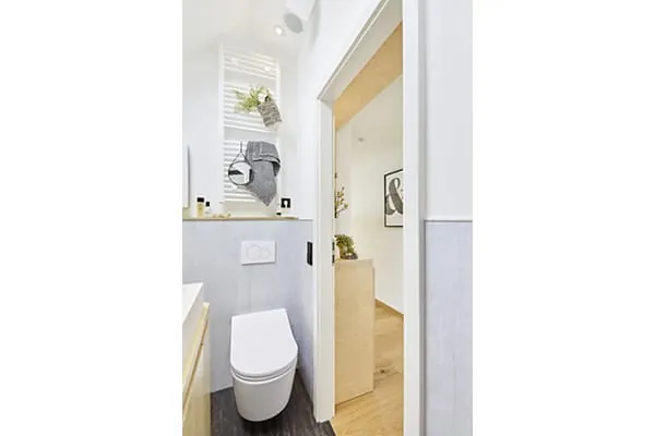 Komfortabel wohnen auf 25 m²? Das von der Bausparkasse Schwäbisch Hall initiierte Projekt „Wohnglück Smarthaus-Tour“ wurde vom Berliner Start-up Cabin One geplant und tourt bis Oktober 2019 durch Deutschland. Ziel ist es, Bauherren und Modernisierern die Möglichkeiten nahezubringen, die in der platzsparenden, funktionalen und dennoch ansprechenden Einrichtung eines extrem reduzierten Wohnraumes liegen. Das Smarthaus hat eine Grundfläche von 2,50 x 10 m. Groß genug, um auch eines der Dusch-WCs von Toto zu integrieren, das Modell RX.